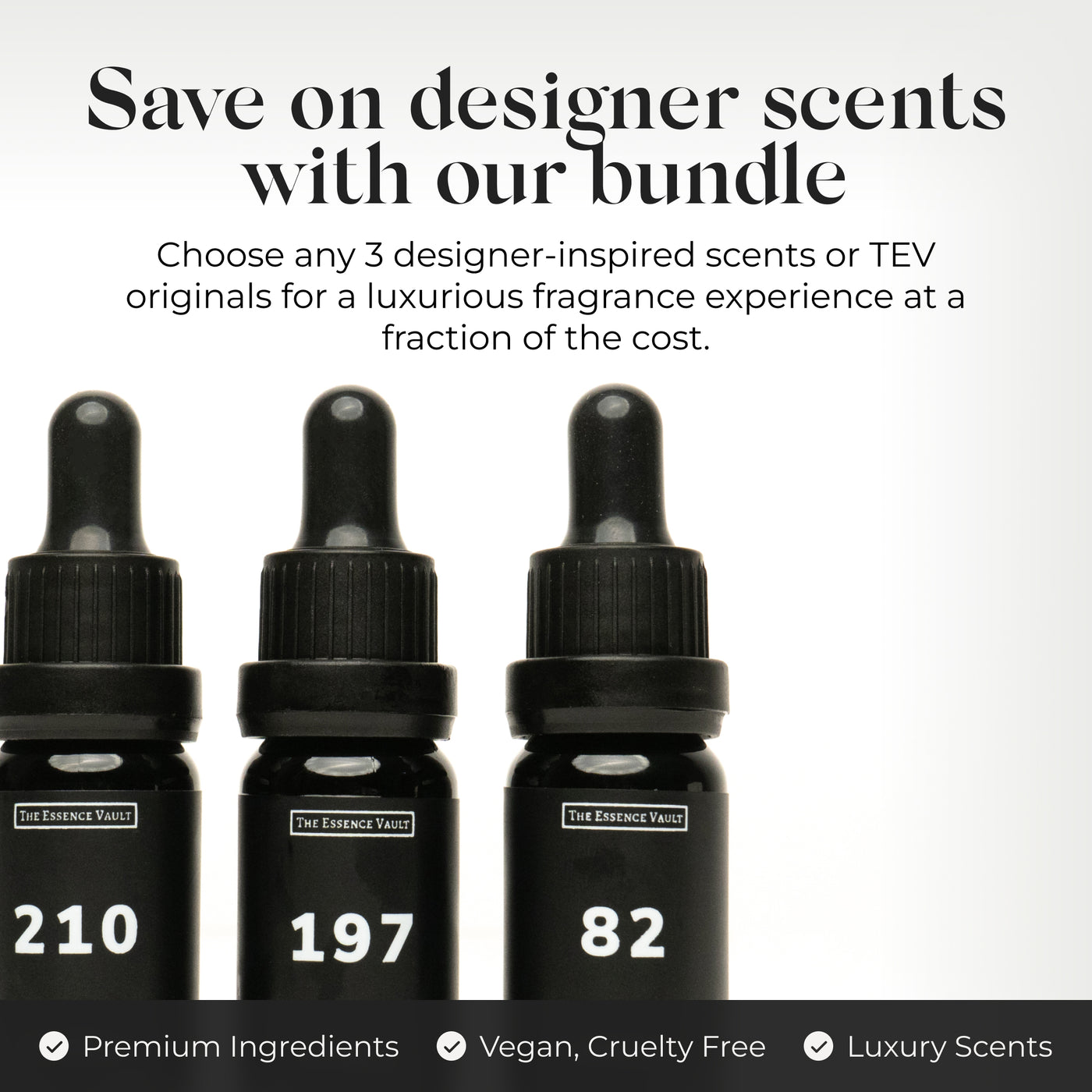We use full strength Parfums - the highest concentration of fragrance oil - and we sourced the best perfumer’s alcohol we could find. Because why pay [38p/62c] per spray for designer perfume that fades too fast, when you can pay 1p for a TEV spray which lasts all day?