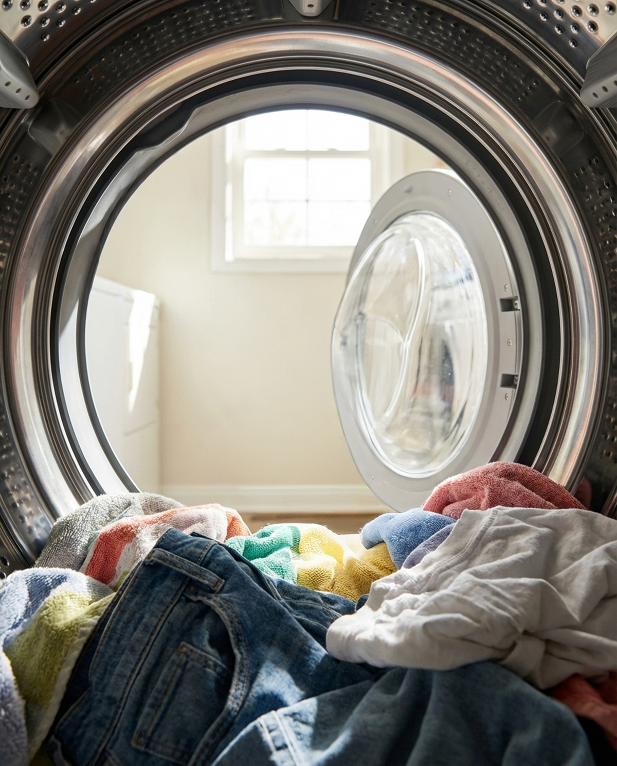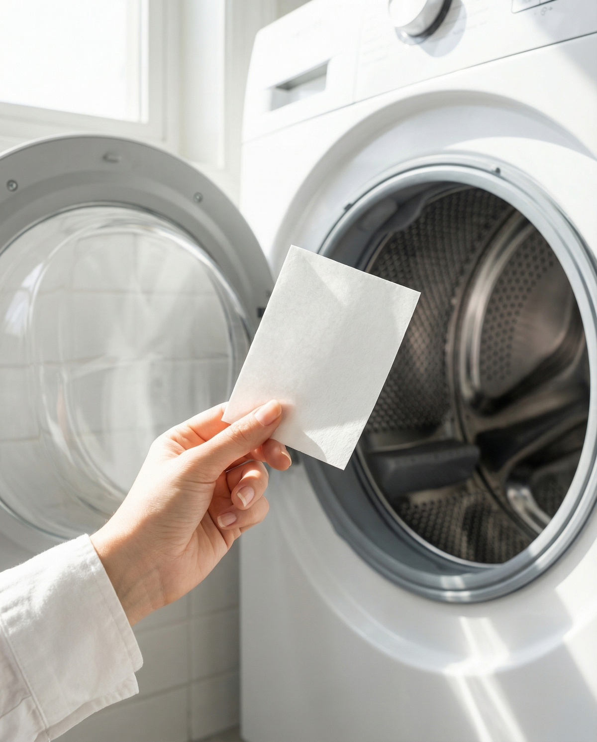 - Toss: Place the sheet directly into the washing machine drum along with your clothes. (Do not put it in the liquid dispenser drawer).